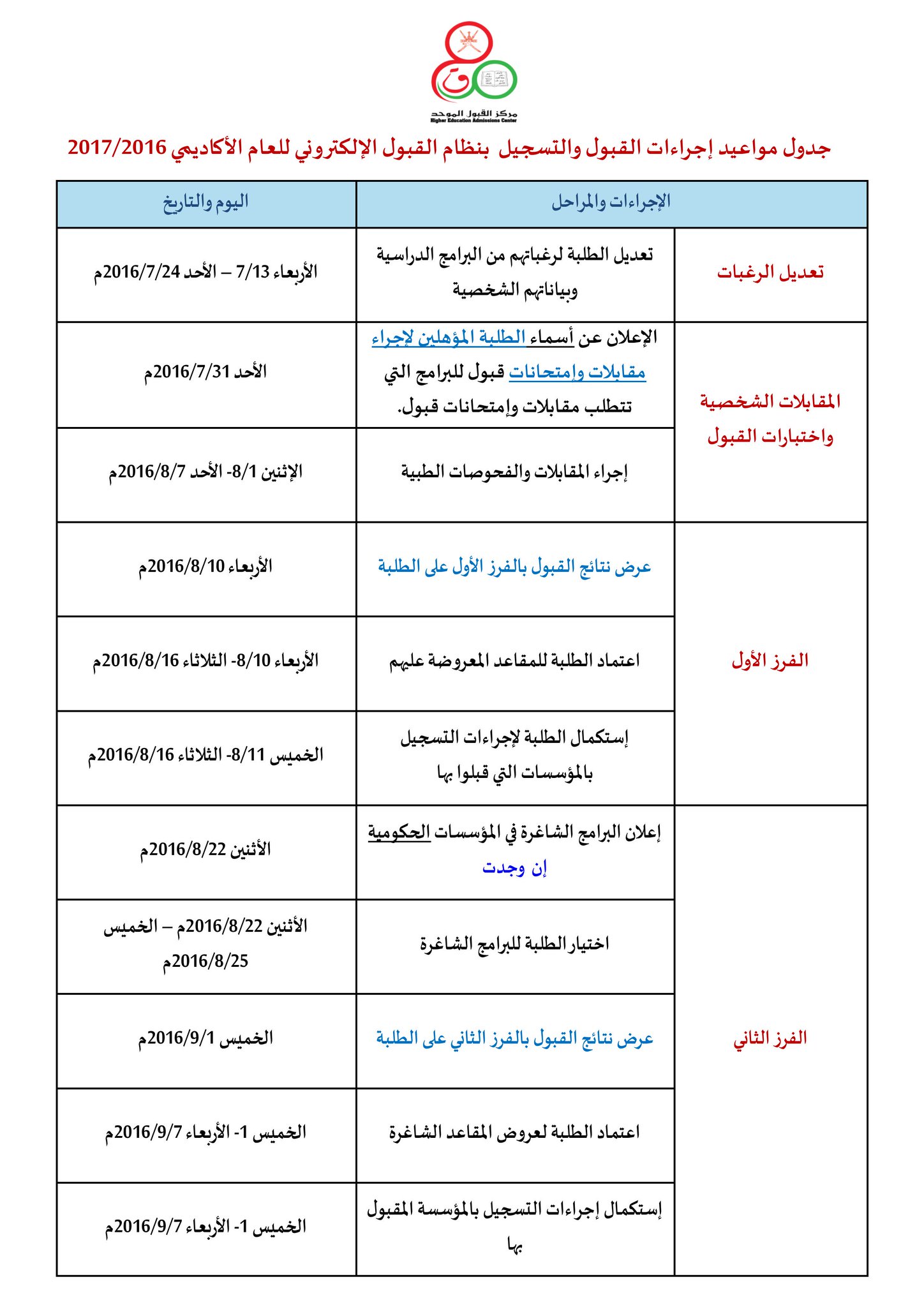 للإطلاع على مواعيد واجراءات القبول اضغط على ايقونة الجدول.